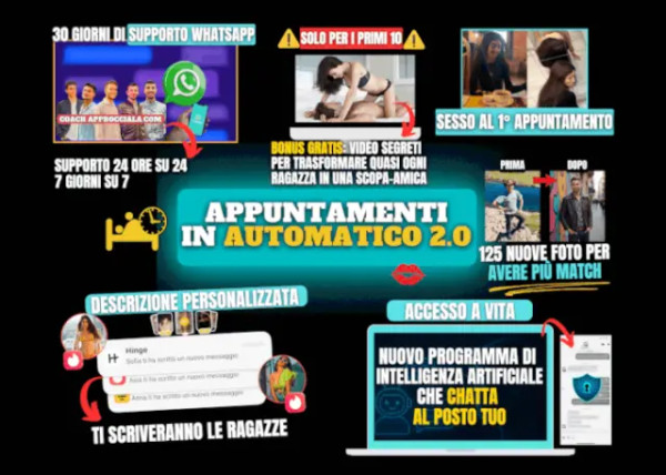 Ti liberi dalla paura del rifiuto e dell’ansia d’approccio. Inizierai ad ottenere i primi appuntamenti e serate piccanti grazie alle app di incontri e l’intelligenza artificiale che gestirà la parte difficile al posto tuo.